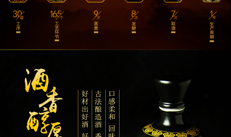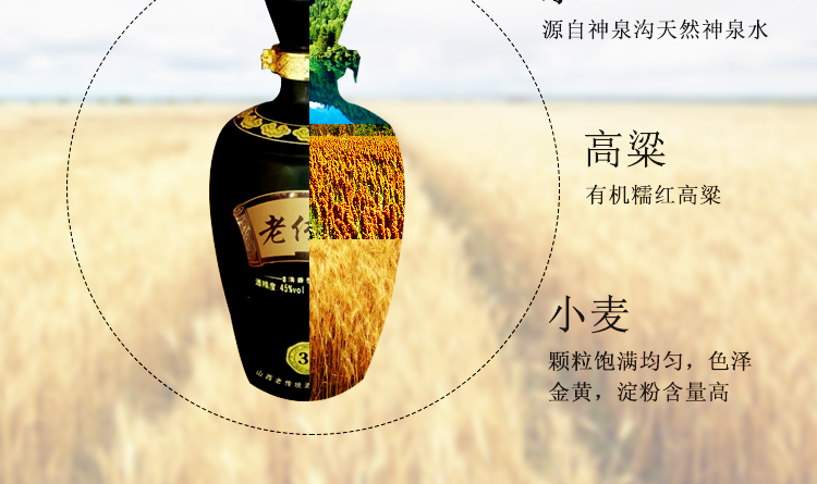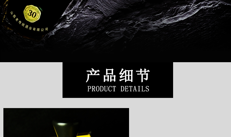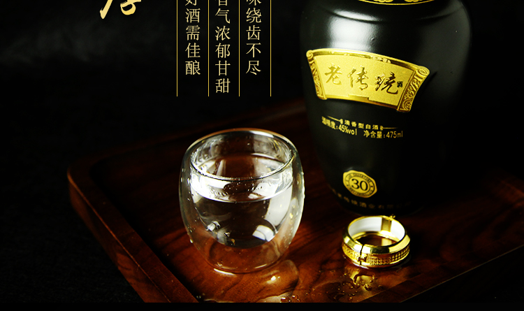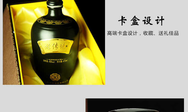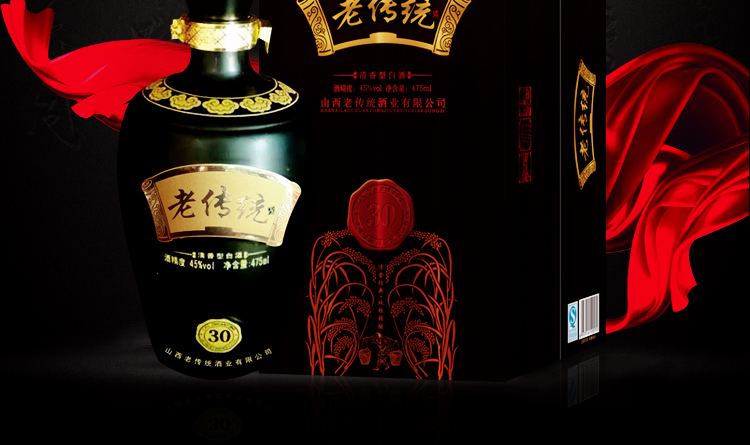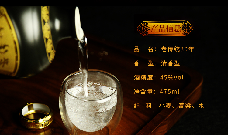名稱:窖藏30年 產地:山西省呂梁市方山縣馬坊鎮 酒廠:山西老傳統酒業有限公司 原料:水、高粱、大麥、豌豆 香型:清香型 酒精度:45%vol 凈含量:475ml 保持期:越存越香 貯藏方式:陰涼、避光、密封保存
